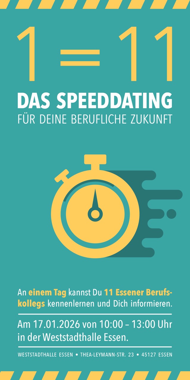 Am Samstag, den 17. Januar 2026, öffnet die Weststadthalle Essen (Thea-Leymann-Straße 23) von 10:00 bis 13:00 Uhr ihre Türen für das nächste „1=11 Speeddating“ der Essener Berufskollegs. Hier haben Schülerinnen und Schüler sowie Eltern die Möglichkeit, elf Berufskollegs und ihre vielfältigen Bildungsangebote in kurzen, informativen Gesprächen kennenzulernen. In Beratungsgesprächen erhalten Sie detaillierte Informationen zu den verschiedenen Bildungsgängen, die zum Fachabitur, zur allgemeinen Hochschulreife sowie zu weiteren Abschlüssen führen.