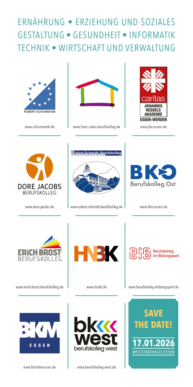 Das Heinz-Nixdorf-Berufskolleg wird auf der Veranstaltung vertreten sein und umfassend über Bildungswege und Berufsperspektiven in den Bereichen Technik und Informatik informieren. Gleichzeitig bietet die Veranstaltung jedoch allen Besuchenden die Gelegenheit, sich über alle fachlichen Schwerpunkte der Essener Berufskollegs in kurzer Zeit zu informieren. Die Veranstaltung bietet eine optimale Gelegenheit, sich zu informieren und beraten zu lassen, um den passenden schulischen Weg zu finden.